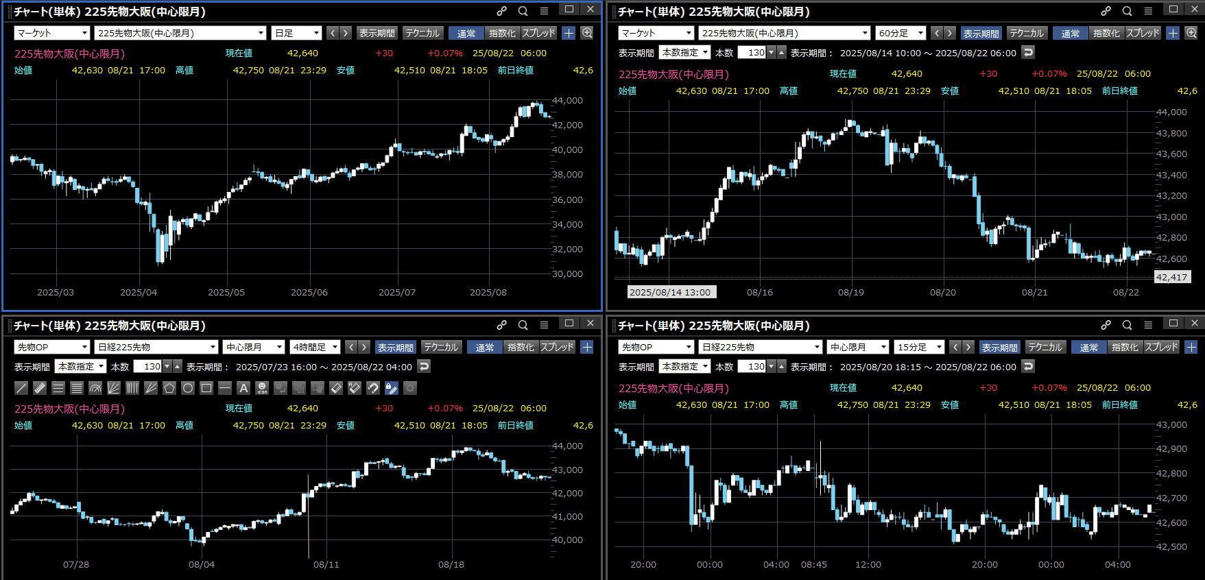 昨日は朝に反転を試みましたが売りが優勢で安値42510円をつけ後がないところまで追い込まれました。