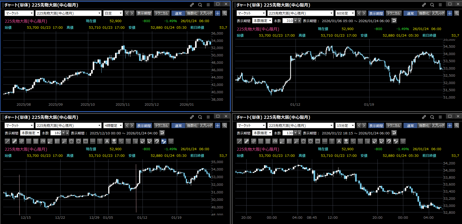 週末、日中は高値圏での上下動でしたがナイトで下げブレイクとなり52900円の安値引けとなりました。