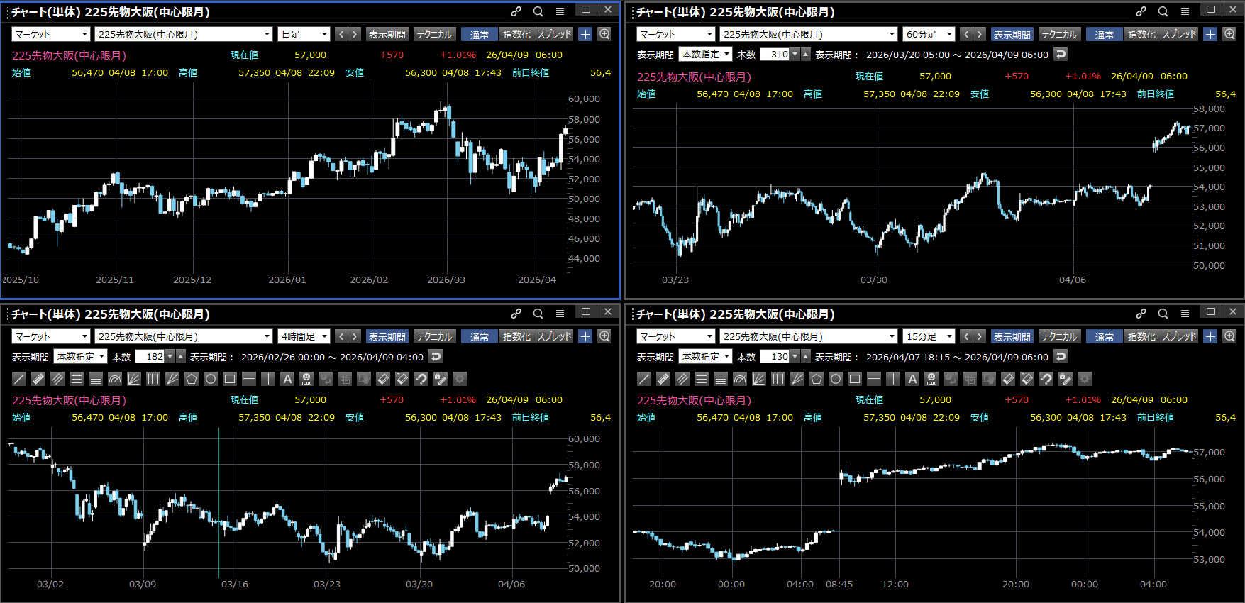 停戦合意を受け225先物は2000円近いギャップアップから上昇し、ナイトでは高値57350円を付けました。