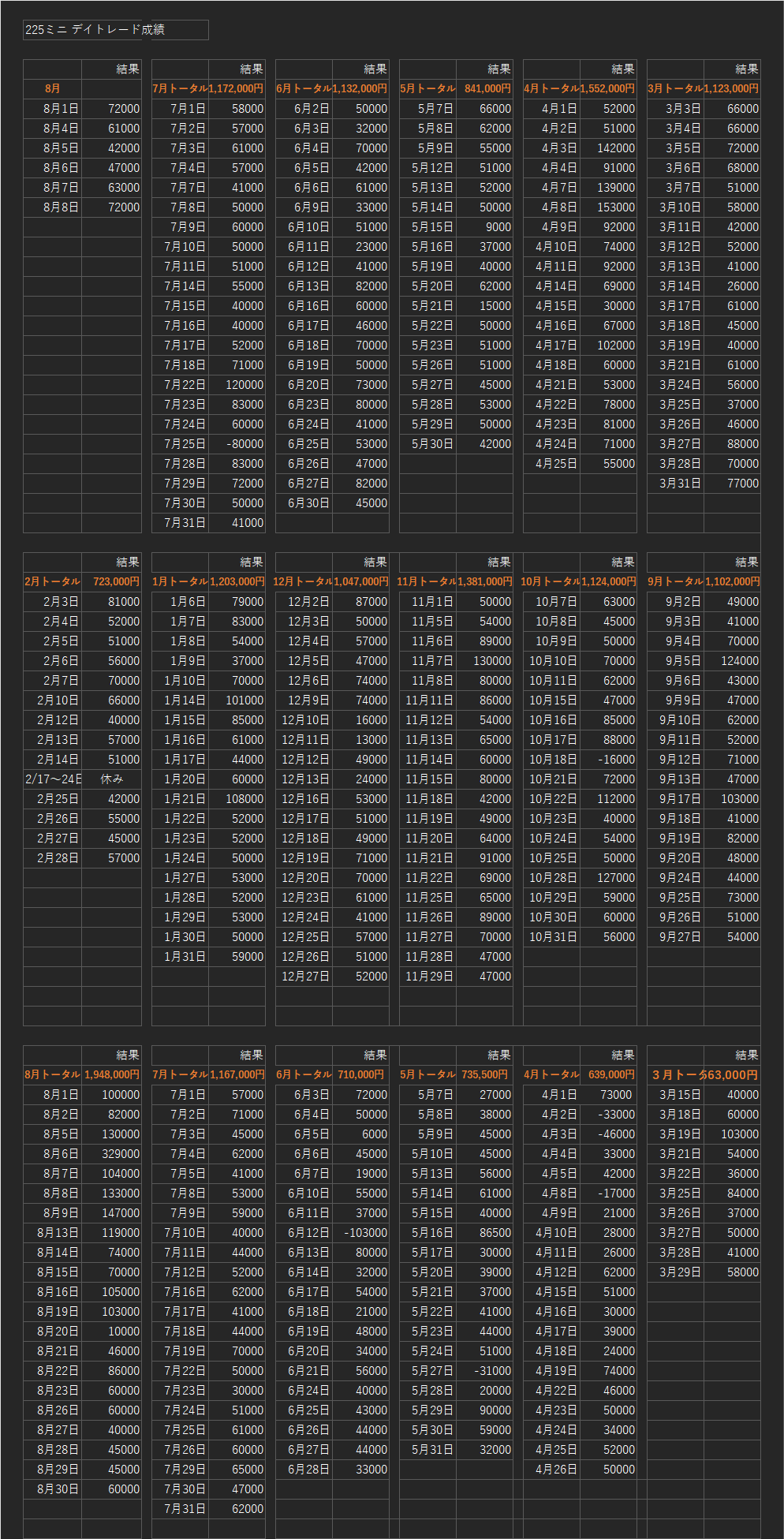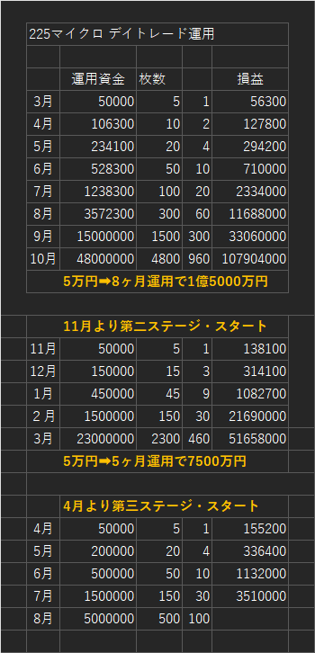 更に225マイクロでは5万円からスタートして10月末(8か月間)で1億5000万円まで資金を増やすことが出来ました。