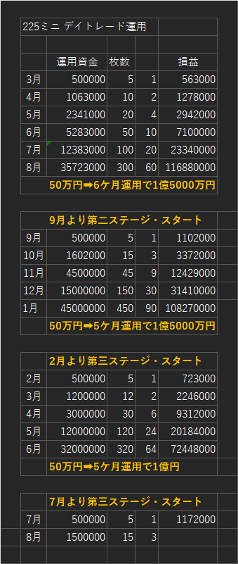 そして225マイクロでスタートの場合、3か月で225ミニに移行できる資金となっています。